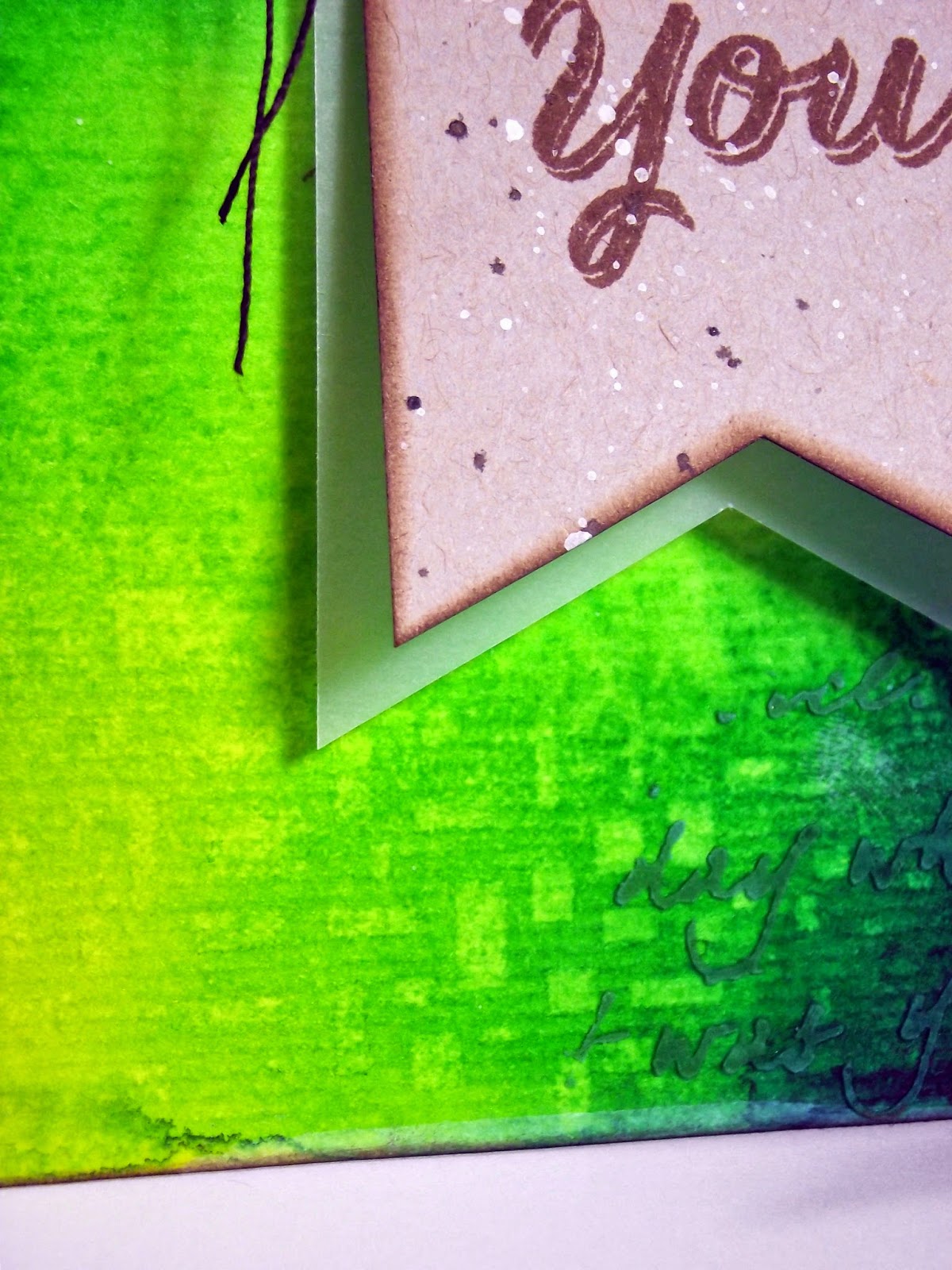 And once the mix media panel was finished, I made a banner with Kraft paper. Stamped the "Thank you", with a brush, I added some white and brown splatters, and I distressed the edges with "gathered twigs" distress ink.