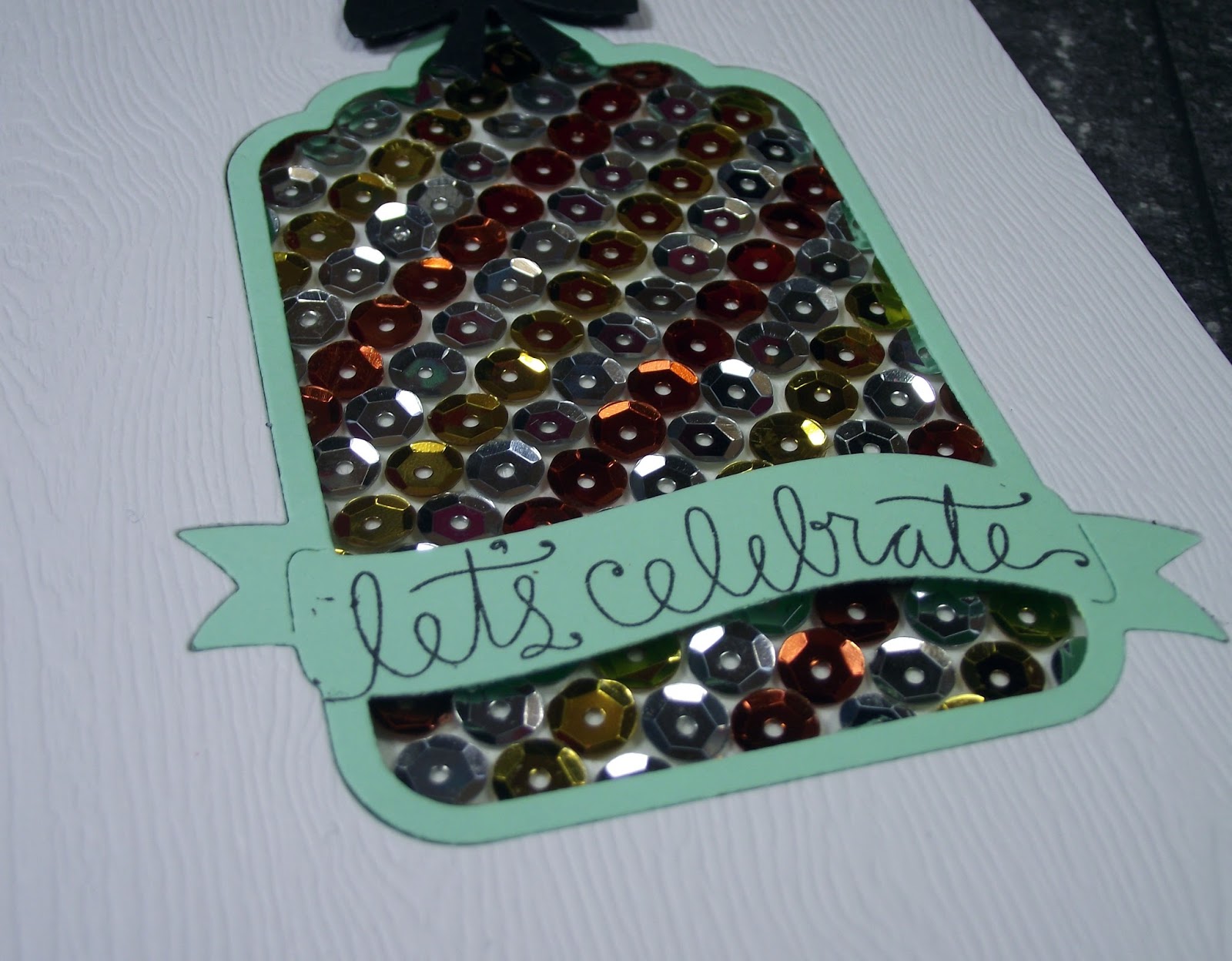 El reto consiste en utilizar oro, plata y cobre en vuestra tarjeta. Yo me decidí por las lentejuelas metalicas, y las pegúe en lineas en el frente de una tarjeta. Entonces lo cubrí con una cartulina con textura de madera de la que había recortado una ventana de etiqueta.