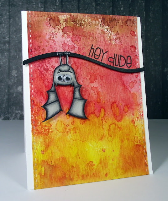 The picture called for a fall card, but it inspired me differently. I used the colors to create a watercolor background using distress inks and water. Then, instead of hanging leaves, I used a hanging bat that I colored using Promarkers: